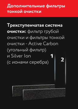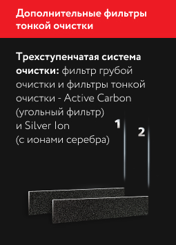 | Дополнительные фильтры тонкой очистки в комплекте | Active Carbon (угольный фильтр) + Silver Ion (с ионами серебра) | Active Carbon (угольный фильтр) + Silver Ion (с ионами серебра) |